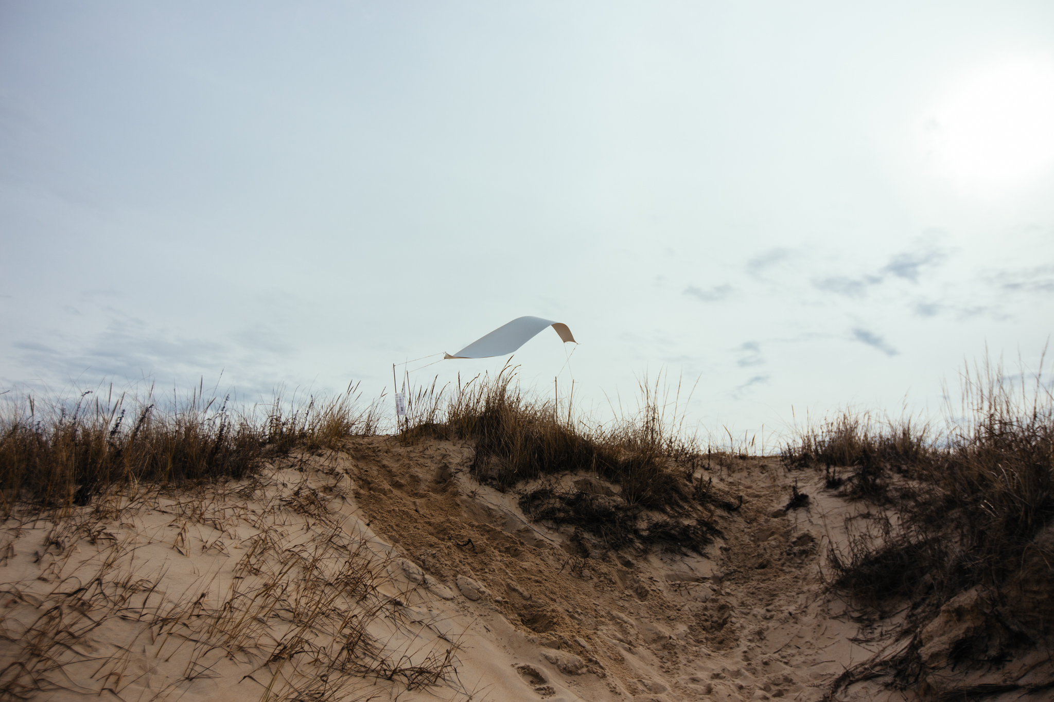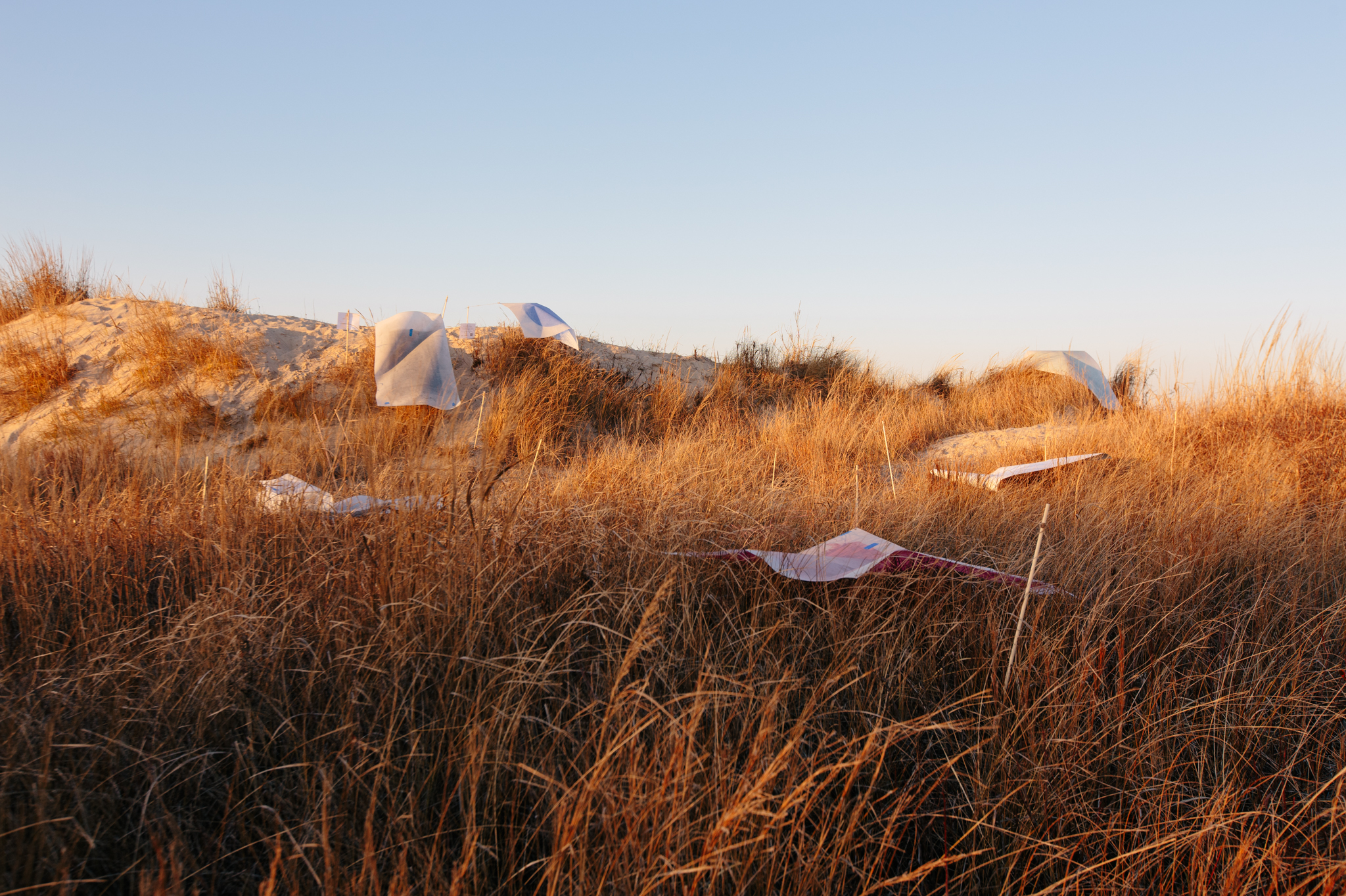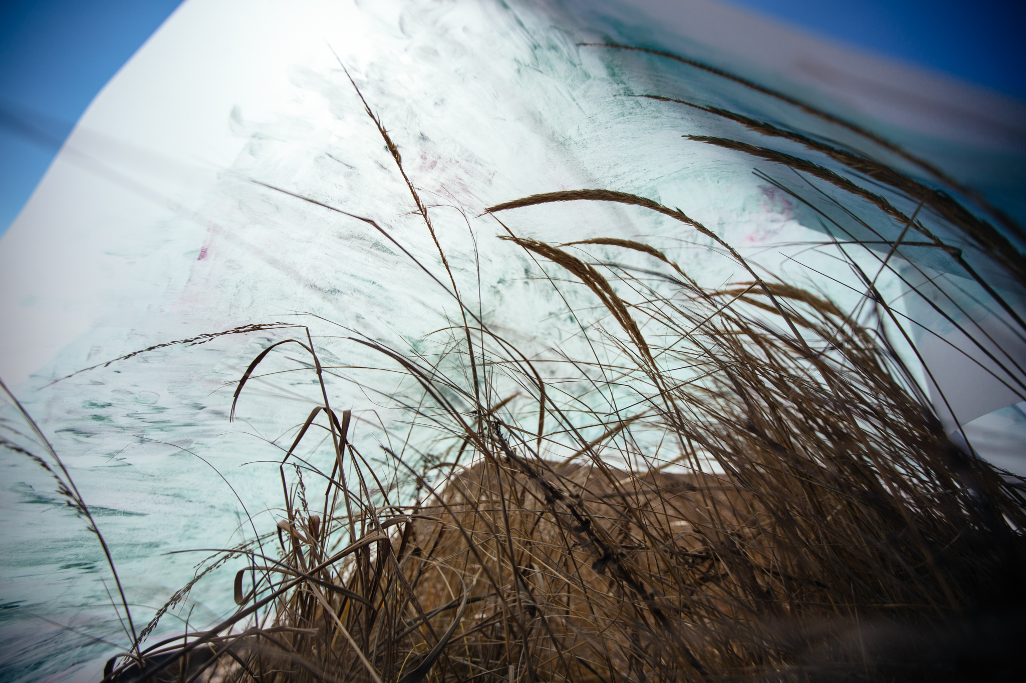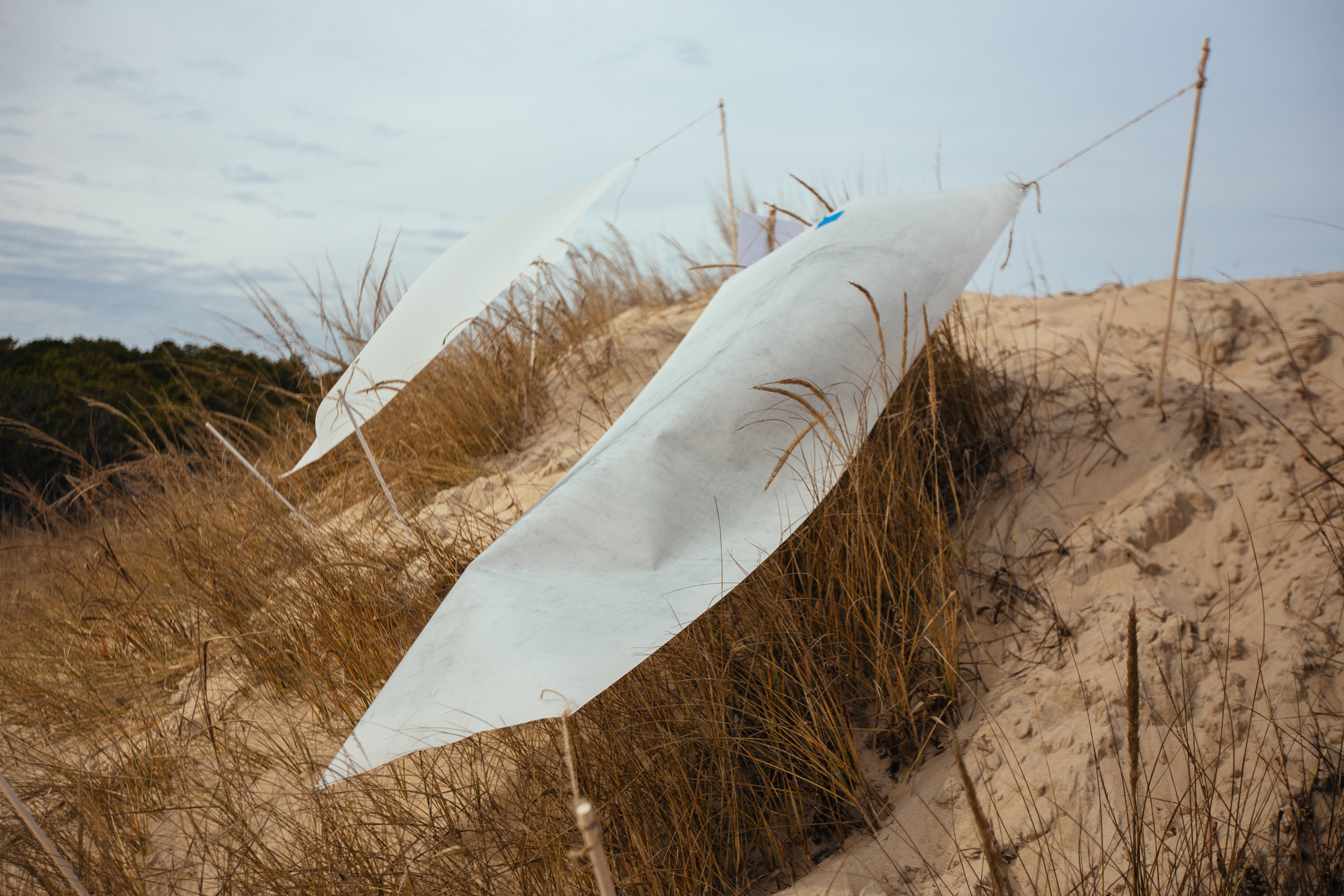 The dunes of Cape Henlopen are a living landscape. Covered in coastal plants and grasses, these ever-shifting sand dunes create and sustain life. The species that builds and shapes the dunes is called American Beach Grass. Each beach grass plant extends roots and shoots called rhizomes that interconnect underground. The grasses depend on wind and sand to supply nutrients and stimulate rhizome growth, which strengthens the dunes. It is this collaborative system of grasses, wind, and sand that inspired the series of artworks [below].”