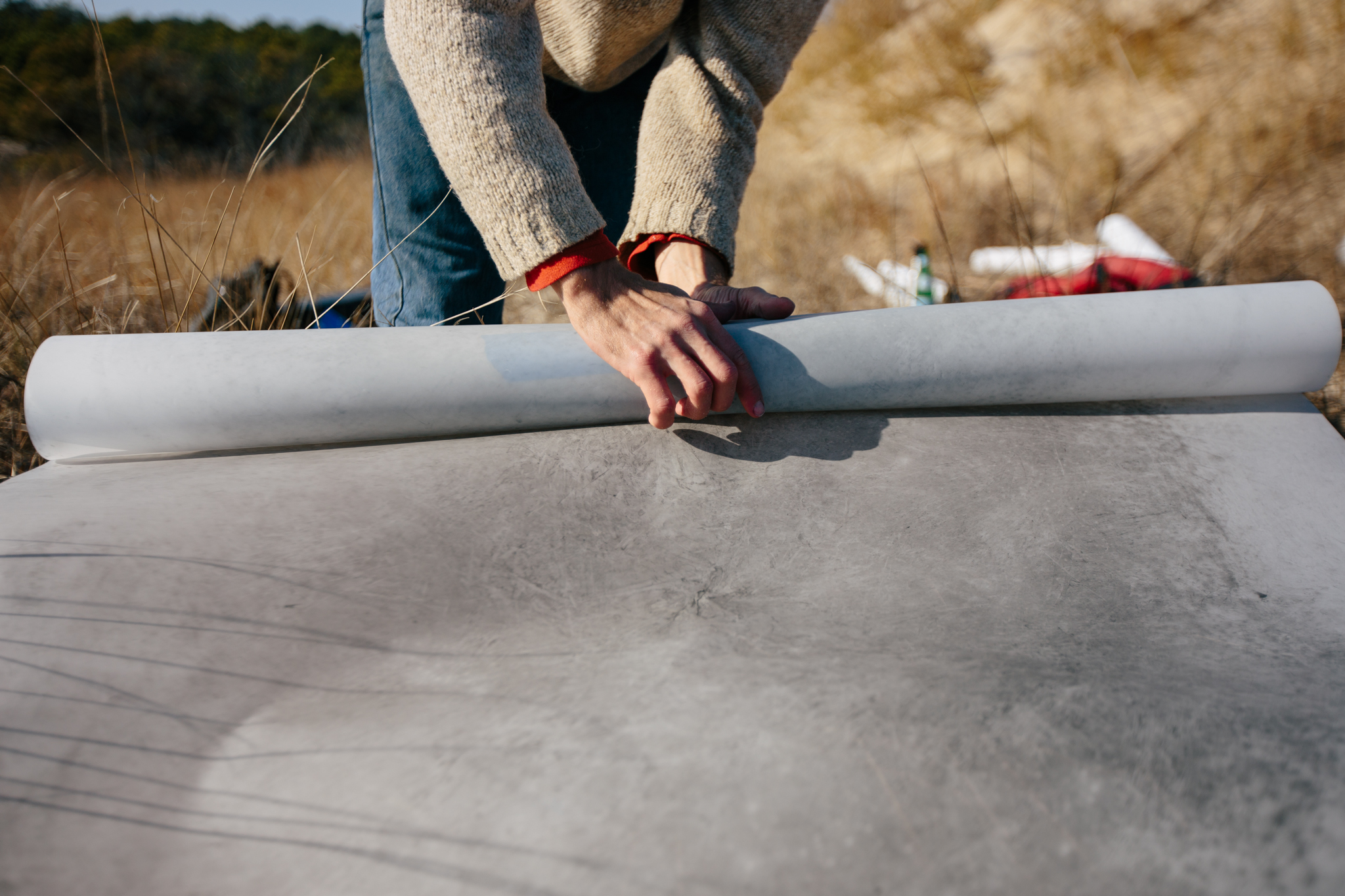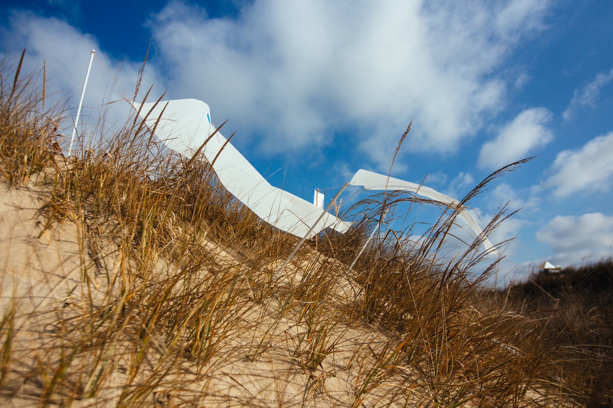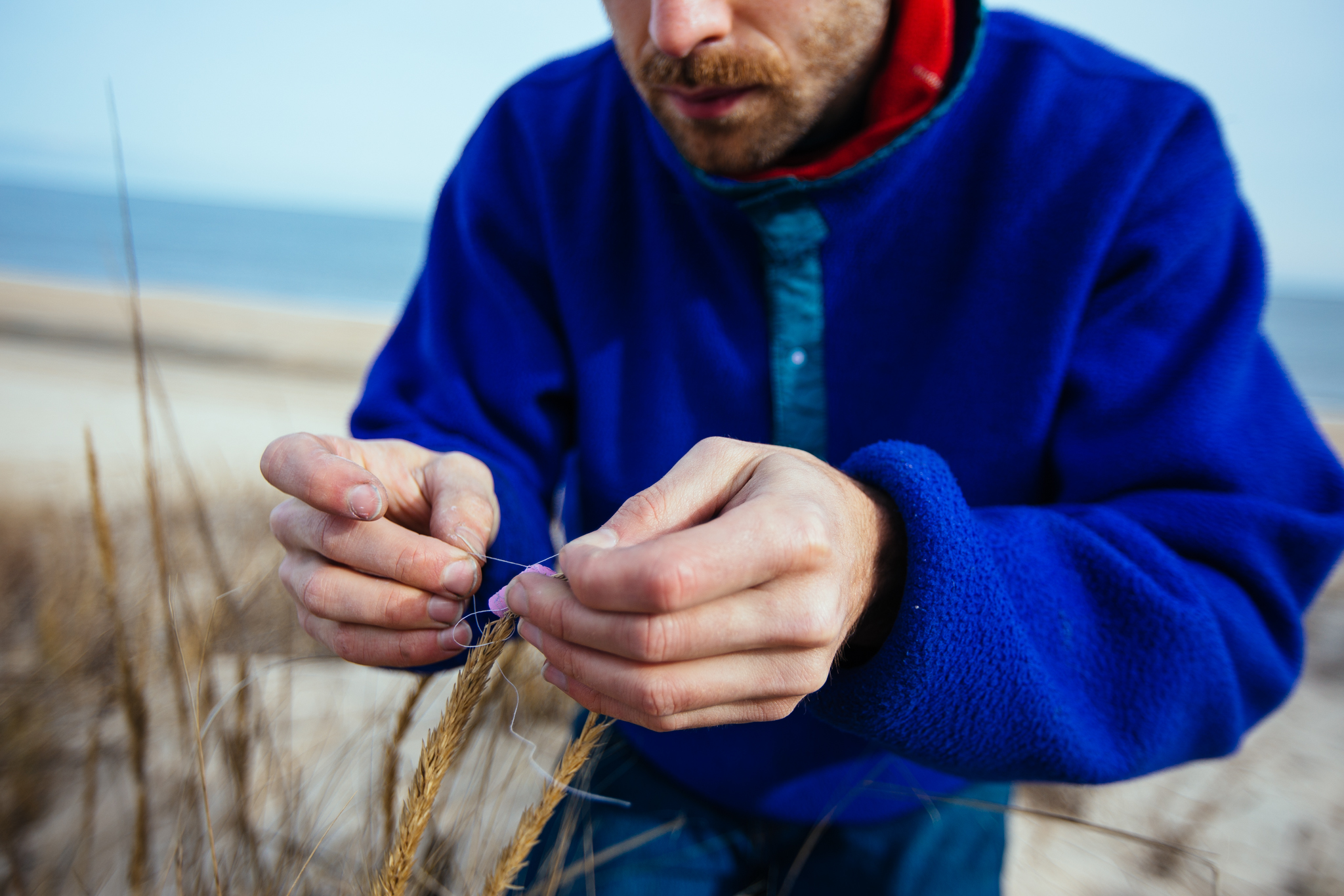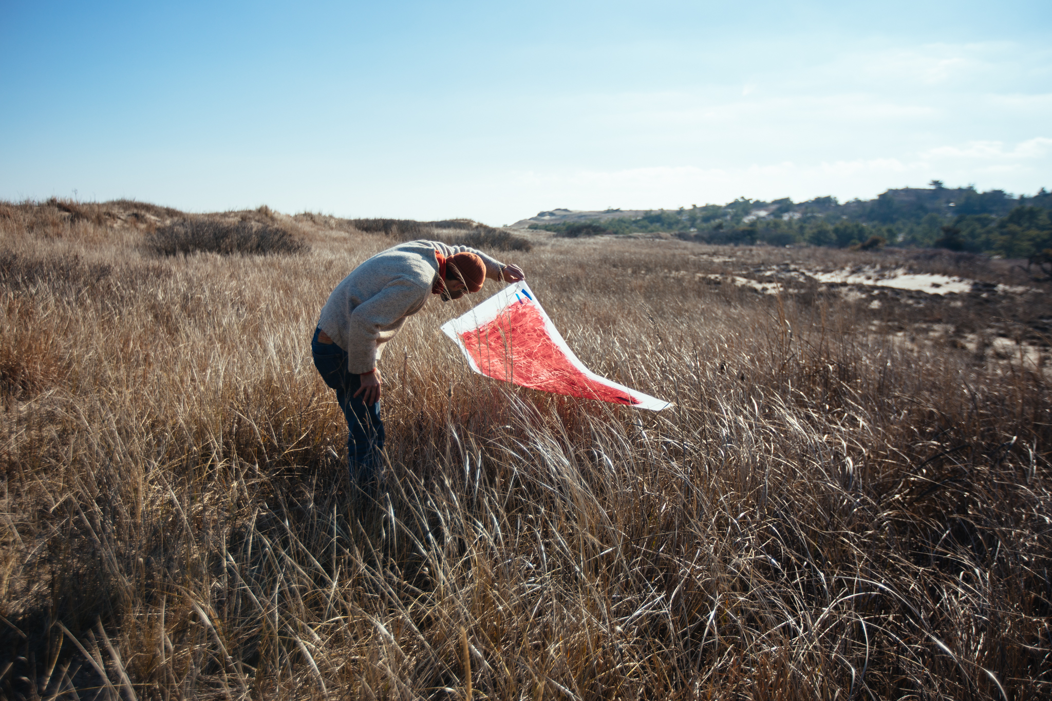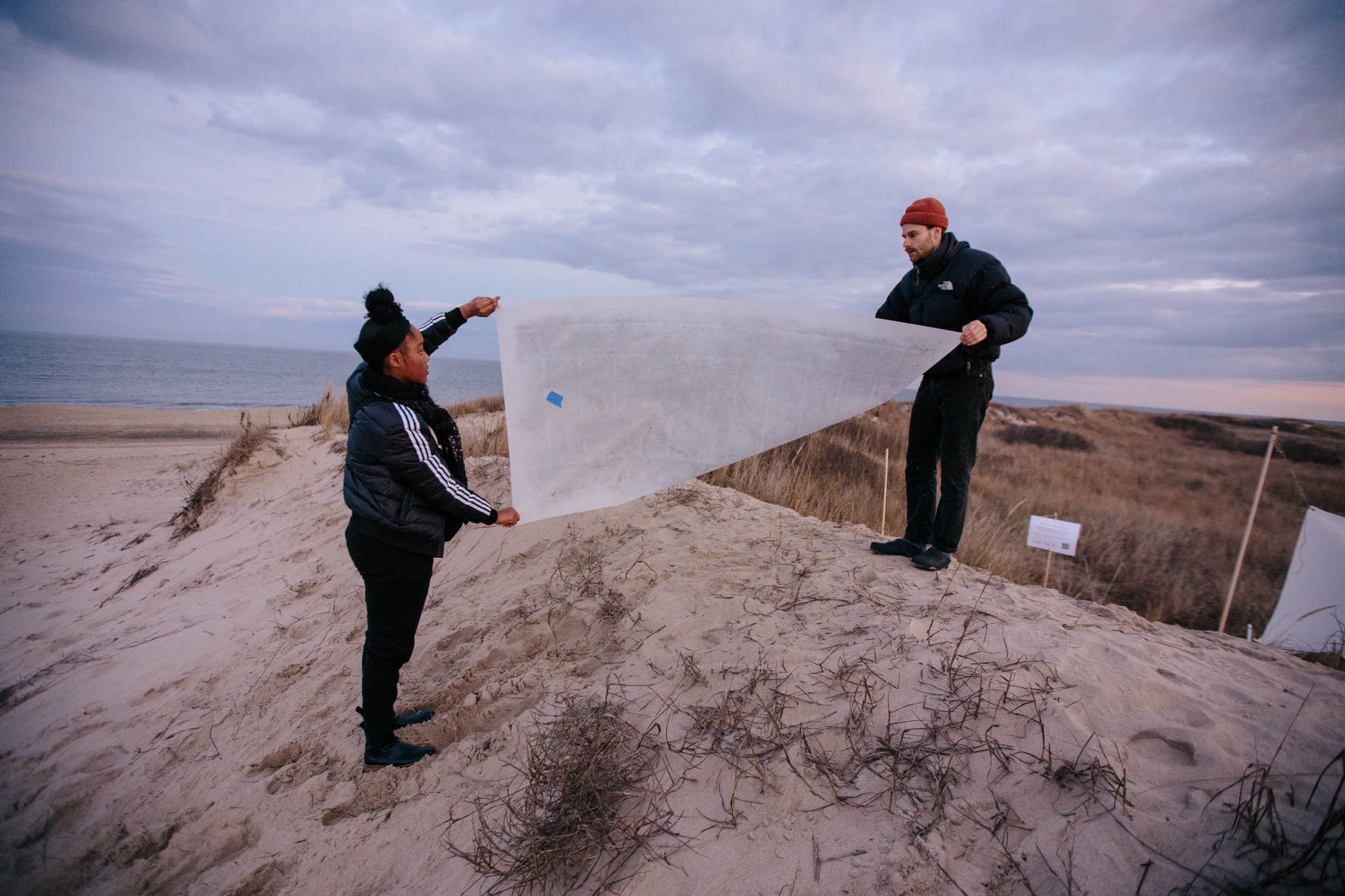 The dunes of Cape Henlopen are a living landscape. Covered in coastal plants and grasses, these ever-shifting sand dunes create and sustain life. The species that builds and shapes the dunes is called American Beach Grass. Each beach grass plant extends roots and shoots called rhizomes that interconnect underground. The grasses depend on wind and sand to supply nutrients and stimulate rhizome growth, which strengthens the dunes. It is this collaborative system of grasses, wind, and sand that inspired the series of artworks [below].”