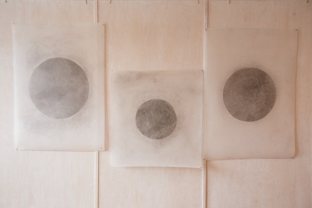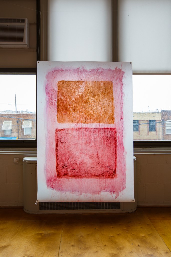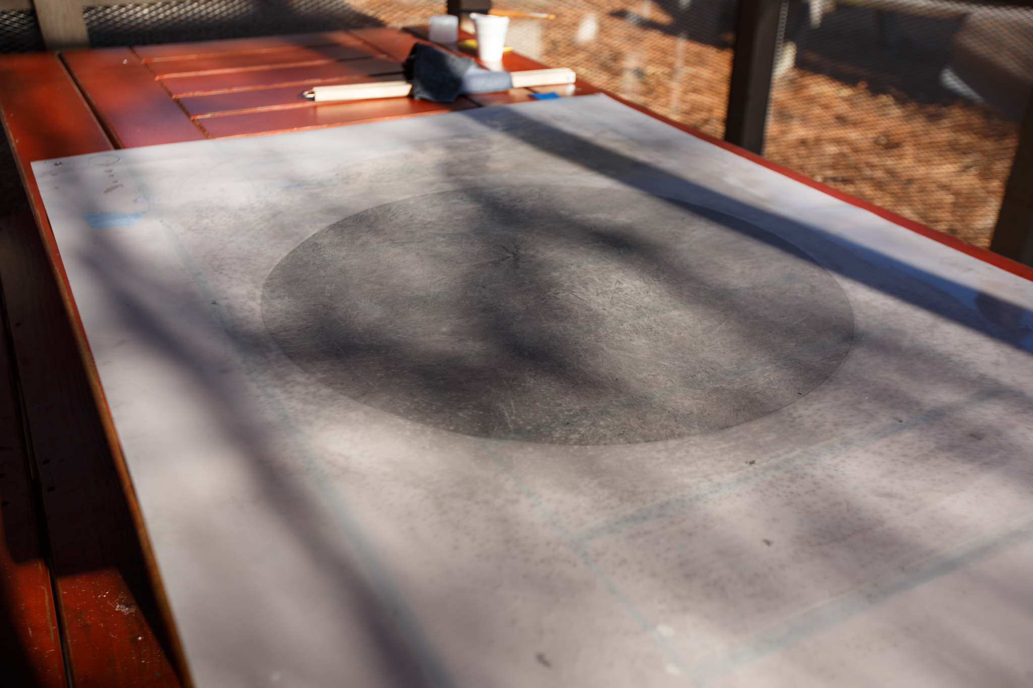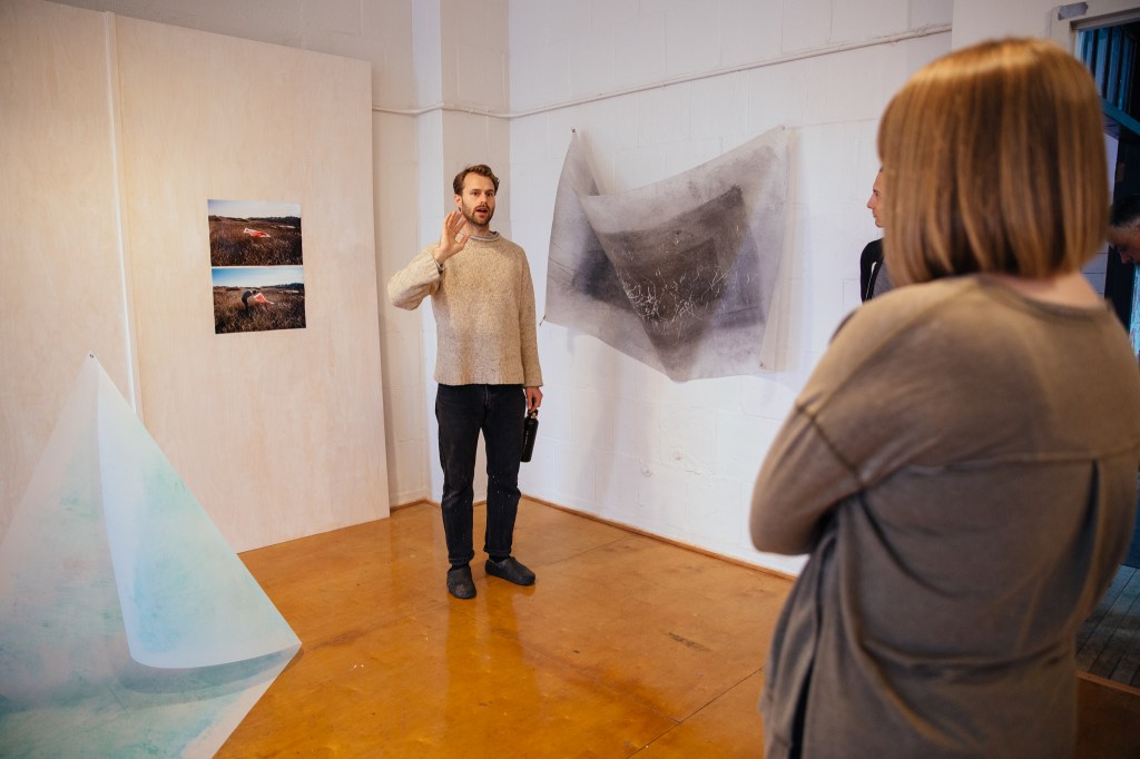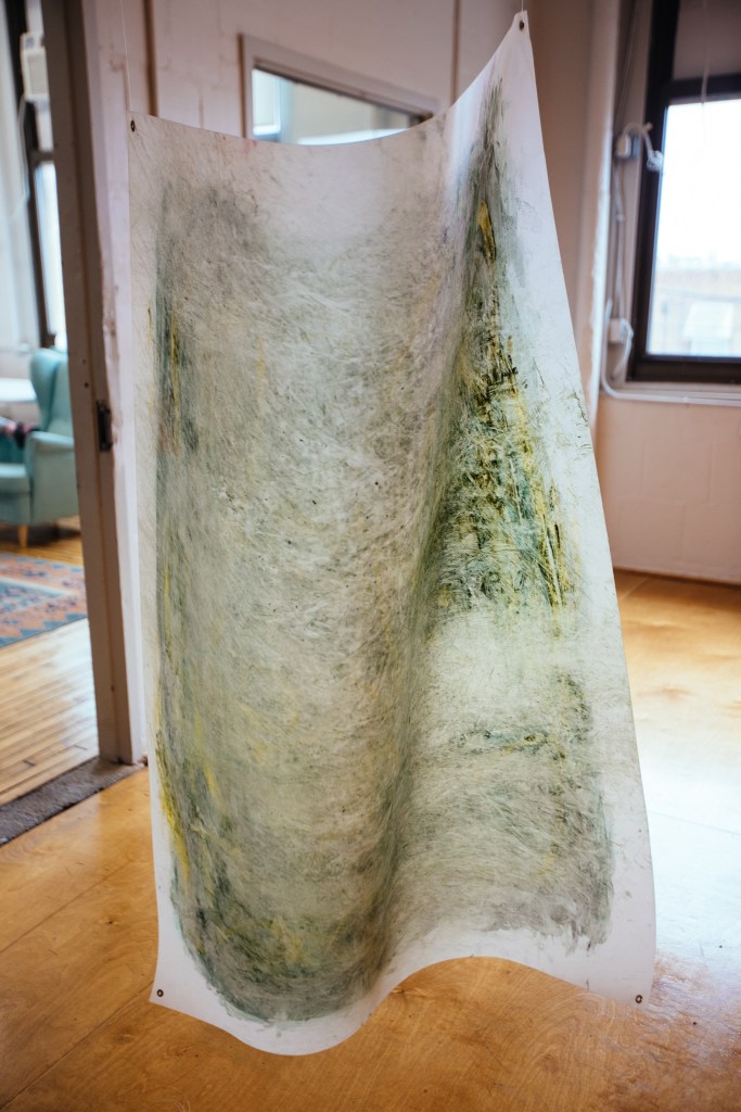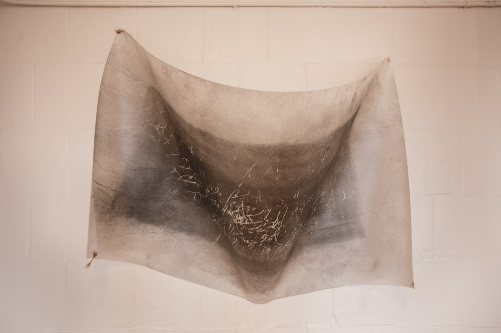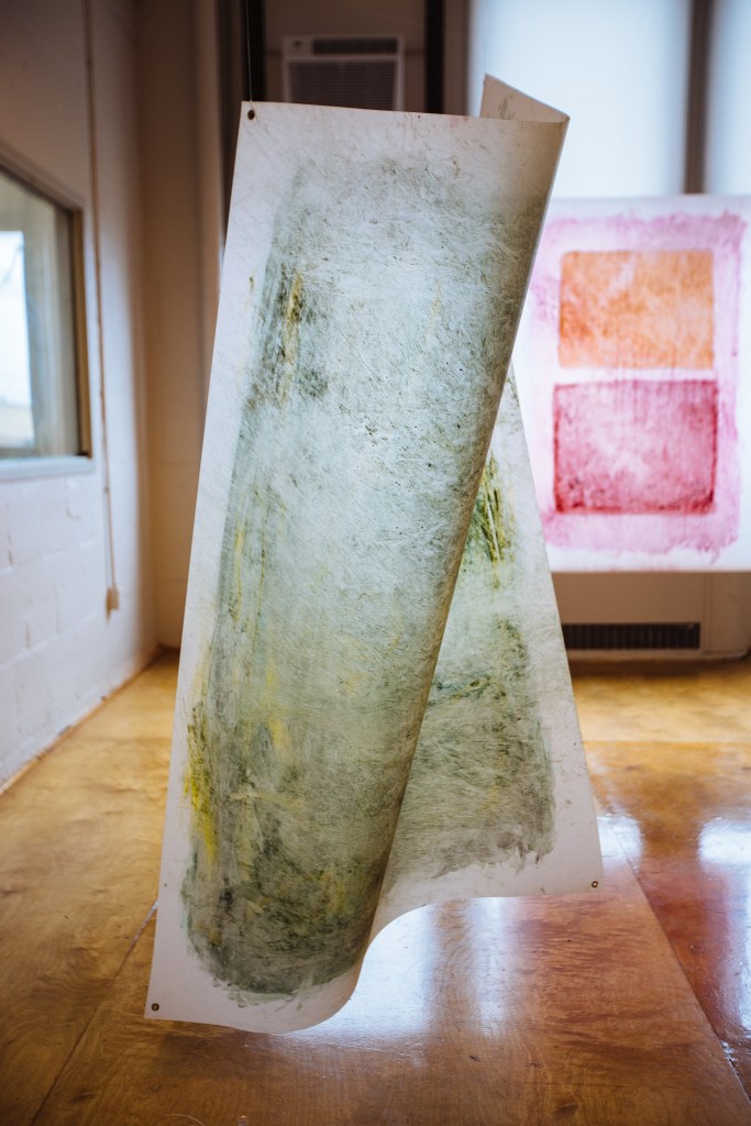 “In January 2023, Monroe Isenberg set out to make collaborative drawings with American Beach Grass at Cape Henlopen. He set up a makeshift art studio in one of the nearby camping cabins. There he applied charcoal and pastels to sheets of semi-translucent film, which he staked above patches of grass. At that point, the creative work was up to the wind, sand, and grasses. The artworks on view represent the “brushstrokes” of beach grass against Isenberg’s prepared film sheets. Depending upon wind conditions, these range from subtle to dramatic.