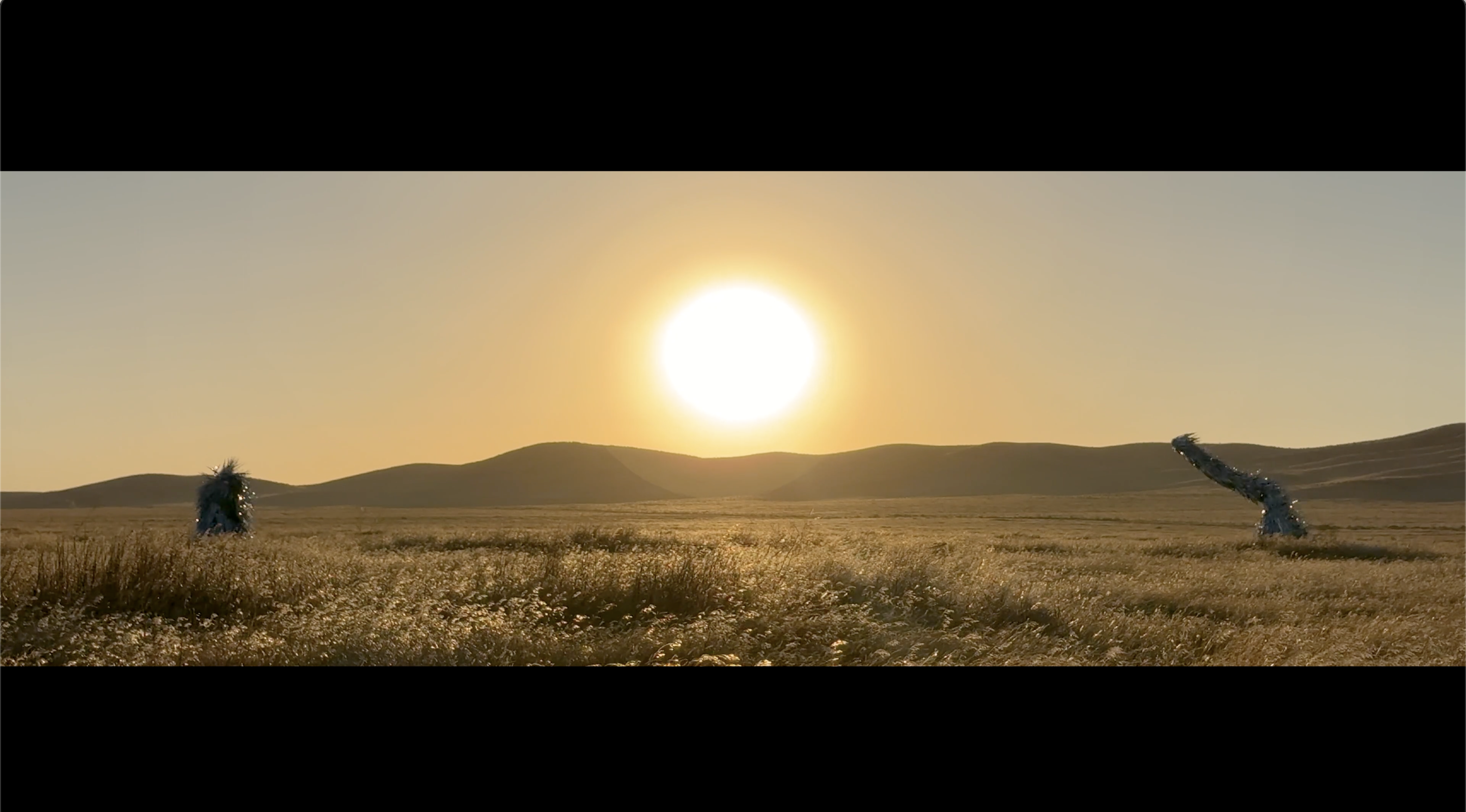 In Monroe Isenberg’s short film, Harbinger, three mirrored Joshua tree entities roam the desert in search of a new home. These alien yet familiar forms reflect sky, land, and light, moving with playful and unique personalities. With musical composition by Elori Saxl, the film reveals an uncanny twilight realm where imagination and reality interweave. This work invites viewers to foster a deeper appreciation for the iconic Joshua tree and desert ecology while referencing migration already underway due to climate change and development.