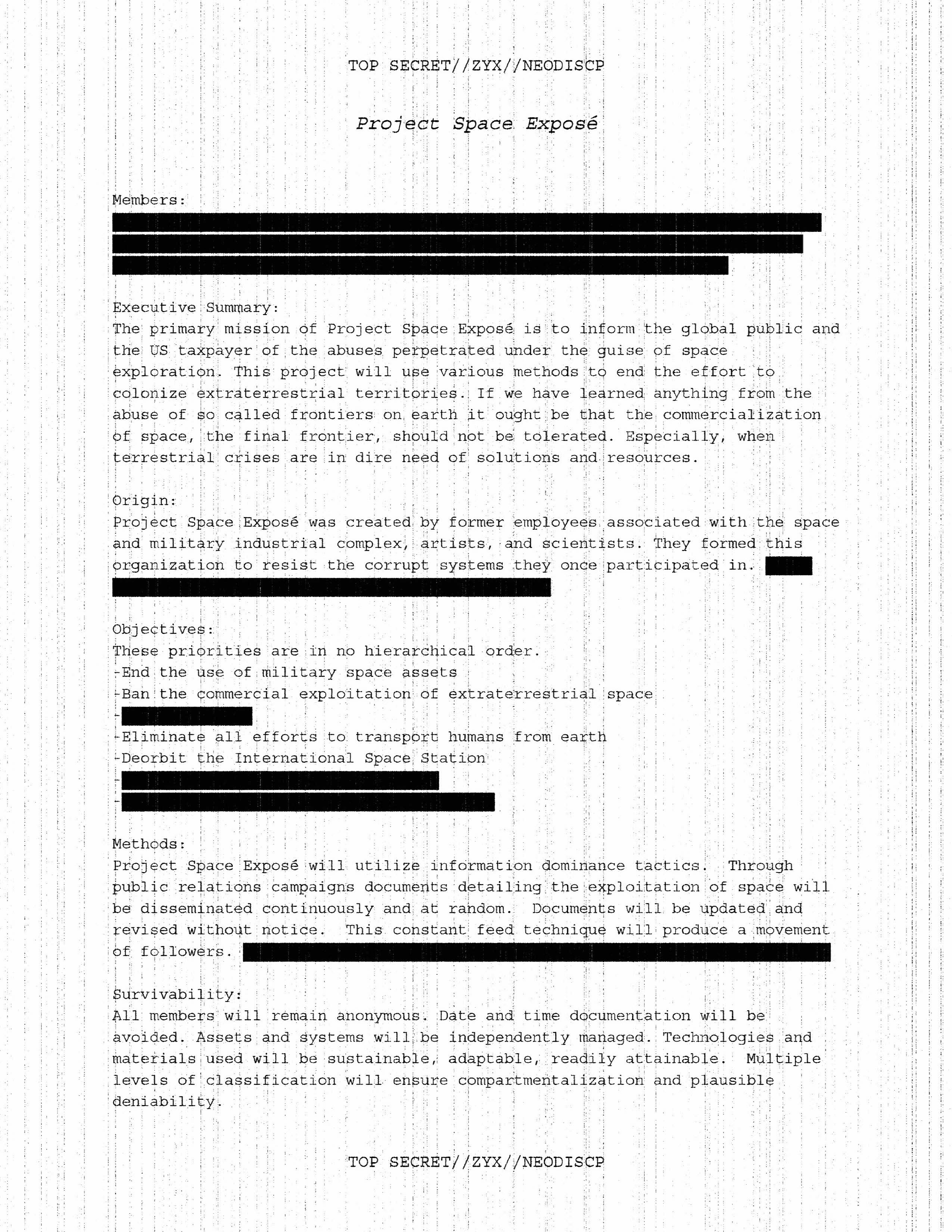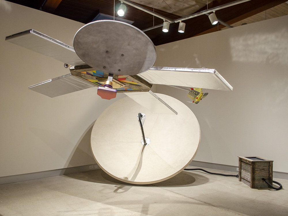 Satellite dish, steel wood, paint, foam, monitor, redacted documents