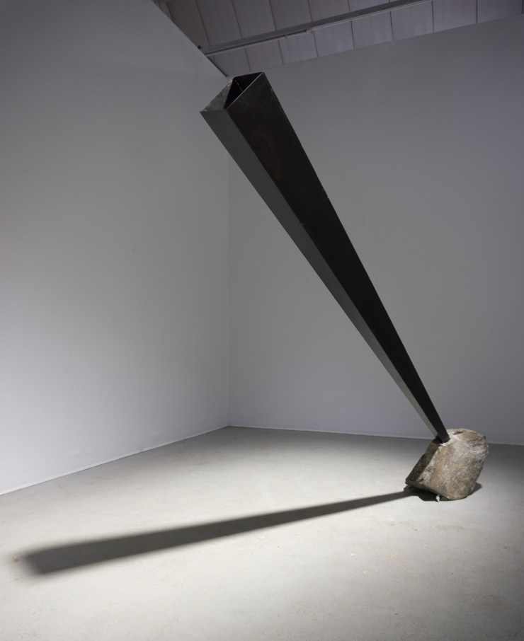 An obscured industrial remnant sits within a nondescript space a top two Pliocene sandstone rocks. Its weightlessness contrasts its placement on the ground. Appearing circular from the front, viewers discover the work is actually flat and disappears altogether from the side.