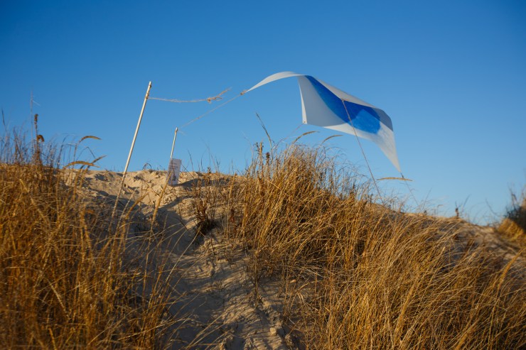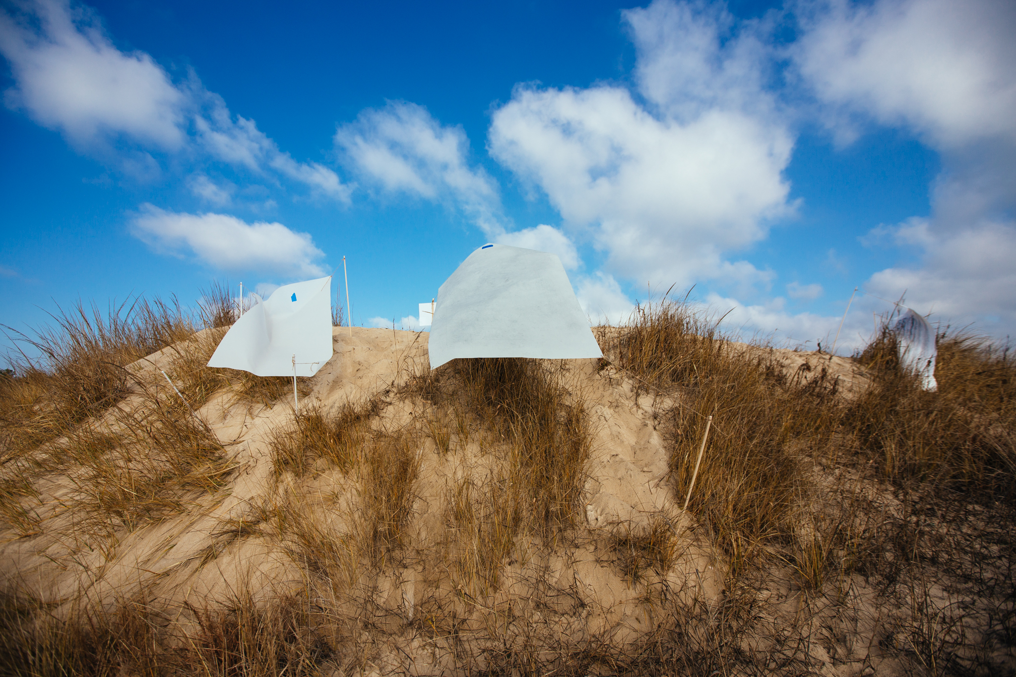 The dunes of Cape Henlopen are a living landscape. Covered in coastal plants and grasses, these ever-shifting sand dunes create and sustain life. The species that builds and shapes the dunes is called American Beach Grass. Each beach grass plant extends roots and shoots called rhizomes that interconnect underground. The grasses depend on wind and sand to supply nutrients and stimulate rhizome growth, which strengthens the dunes. It is this collaborative and creative system of grasses, wind, and sand that inspired the series of artworks.”