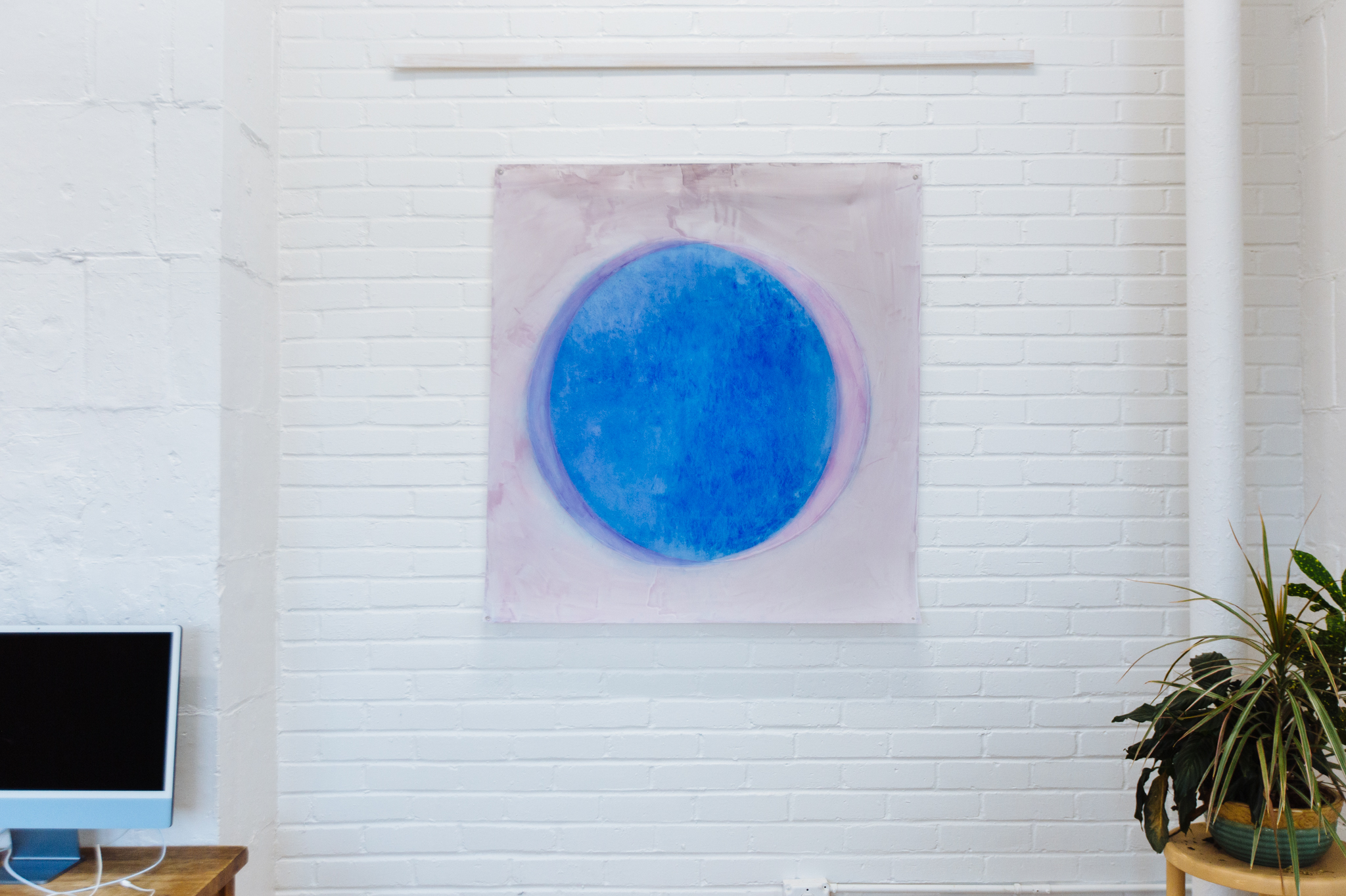 This convex wall hanging sculpture diffuses the light and color it contains. As the viewer engages the work, the blues evolve and change. To produce the work’s color, the sunrise in Iceland was documented for three hours. Various blue tints were then carefully selected from the video and reproduced as hand-mixed pigment. The video referenced is Blue Sunrise.