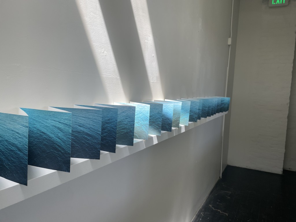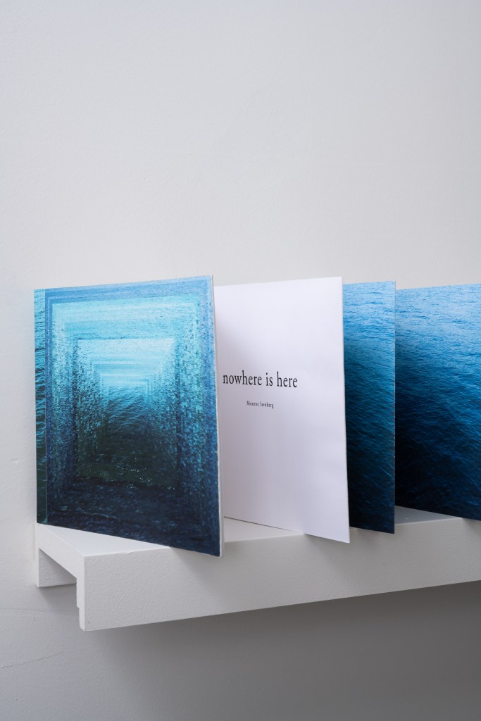 nowhere is here is a handmade accordion fold sculpture and book that was developed in conversation with Ed Roucha’s All the Buildings on the Sunset Strip. Sixty photographs were taken of the ocean in Skuløya, Norway over an hour. Each page is one photo taken every minute in that hour. Every page appears different and the water’s subtle color changes become a marker of time.