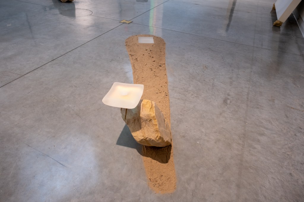 “Luminescence. Grains of sands. Relics of unknown origins and impossible futures. Monroe Isenberg transmutes mundane, human-crafted elements into reflections on the dance of time, the expanse of space, and the untamed essence of the natural realm. These sculptures ascend as monoliths, foreign yet intimately familiar. Through the alchemy of fusing, sanding, and even video projection-intricate connections are woven, resonating with the mystique of Nordic isles and the ever-shifting tapestry of environments in flux. Nowhere is truly here.