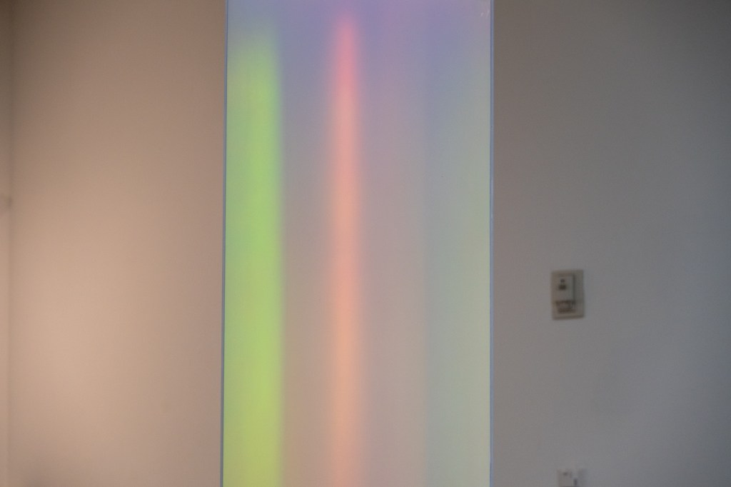Referencing Kubrick’s 2001 Space Odyssey, Nonolith explores light’s relativistic qualities and was created to function as a relic from a future not yet in focus. Viewers experience the internal colors change and respond to their movement. This effect occurs completely naturally.
