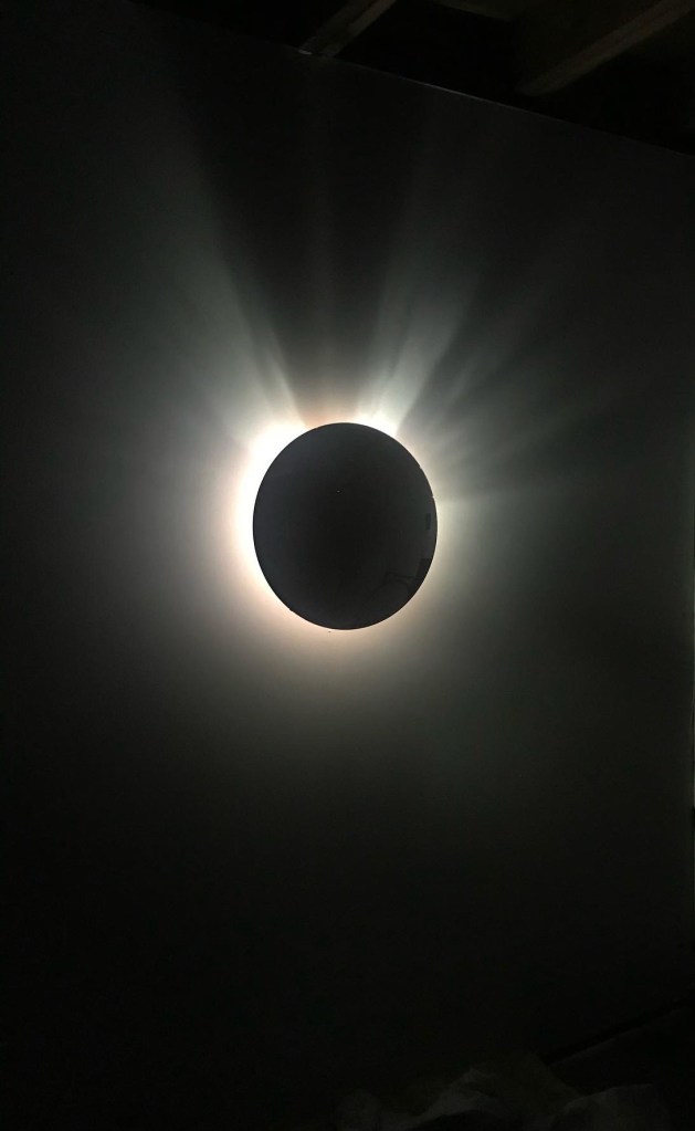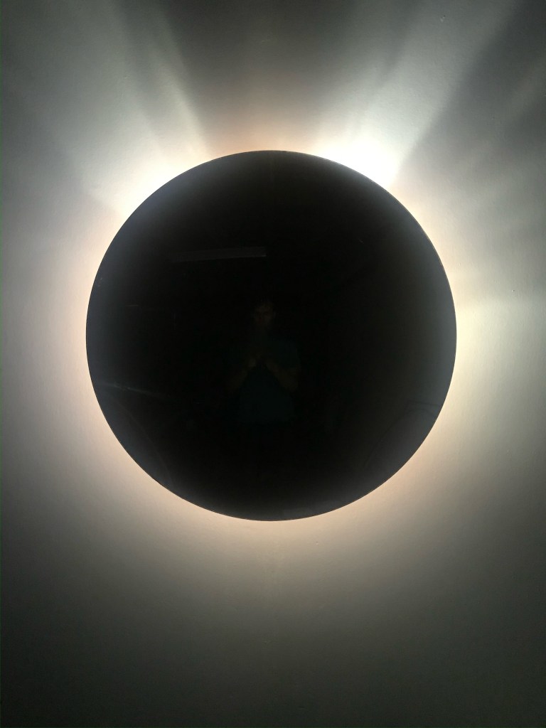The work is a study of light — a convex glass mirror refracts the light that emanates behind it in a darkened room. As the view approaches, their darkened reflection can be seen from within the eclipsed light.