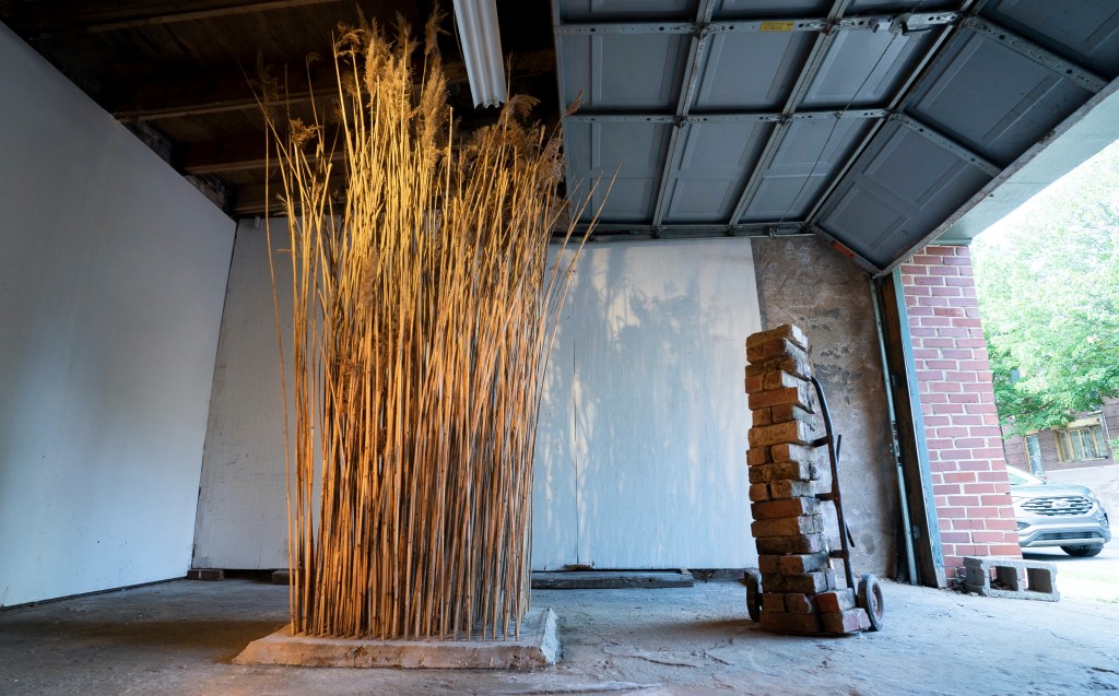 An installation with phragmites— a mostly invasive colonizer plant species that thrives in swampy marshes was created. They are positioned next to centuries old bricks unearthed during recent construction in Cedar Park, West Philadelphia. The bricks are remnants of a city and place that is no longer visible but still the industrial foundation of the city. Positioning both the bricks, earth, and phragmites together invites viewers to consider their relationships.